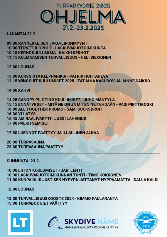 Hämeen Laskuvarjourheilijat ry järjesti vuoden 2025 Turpaboogien Vääksyssä yhteistyössä Laskuvarjotoimikunnan kanssa. Tapahtumapaikkana oli Hotelli Tallukka. Luennot alkoivat lauantaina, vapaamuotoiset etkot jo perjantaina 21.2.